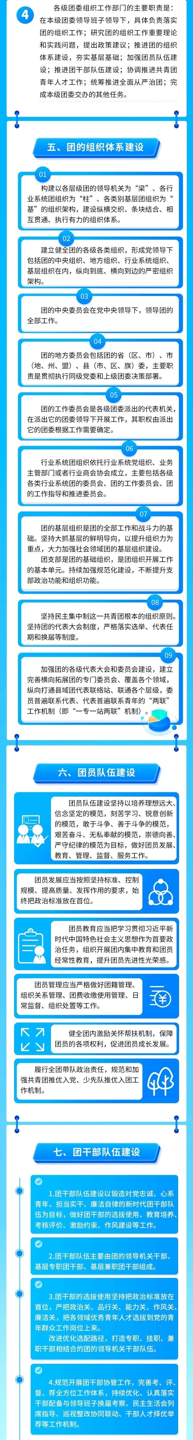 《条例》共分为九个章节,从领导和职责、团的组织体系建设、团员队伍建设、团干部队伍建设、青年人才队伍建设、全面从严治团、支持和保障等方面作出规定。
