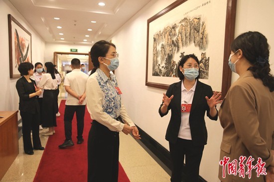 6月20日,北京京西宾馆,中国共产主义青年团第十九次全国代表大会分组会议休息间隙,河北代表团的代表们在会议室外交谈。中青报·中青网记者 陈剑/摄